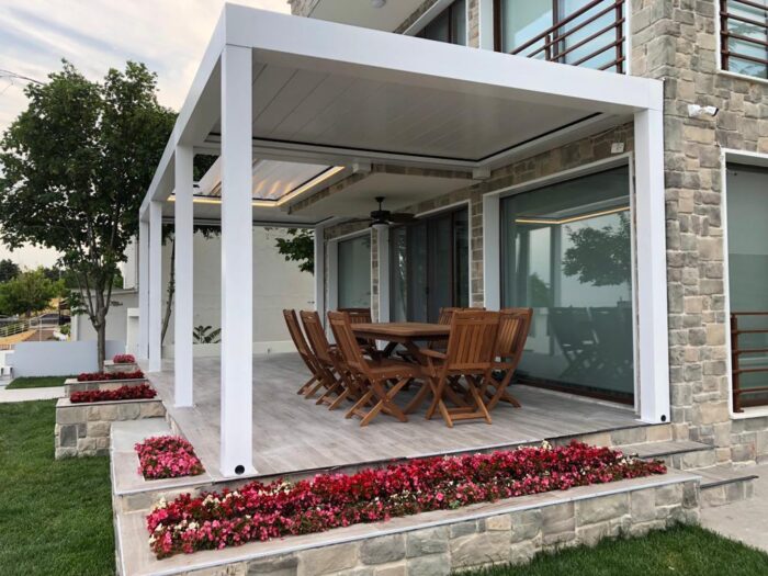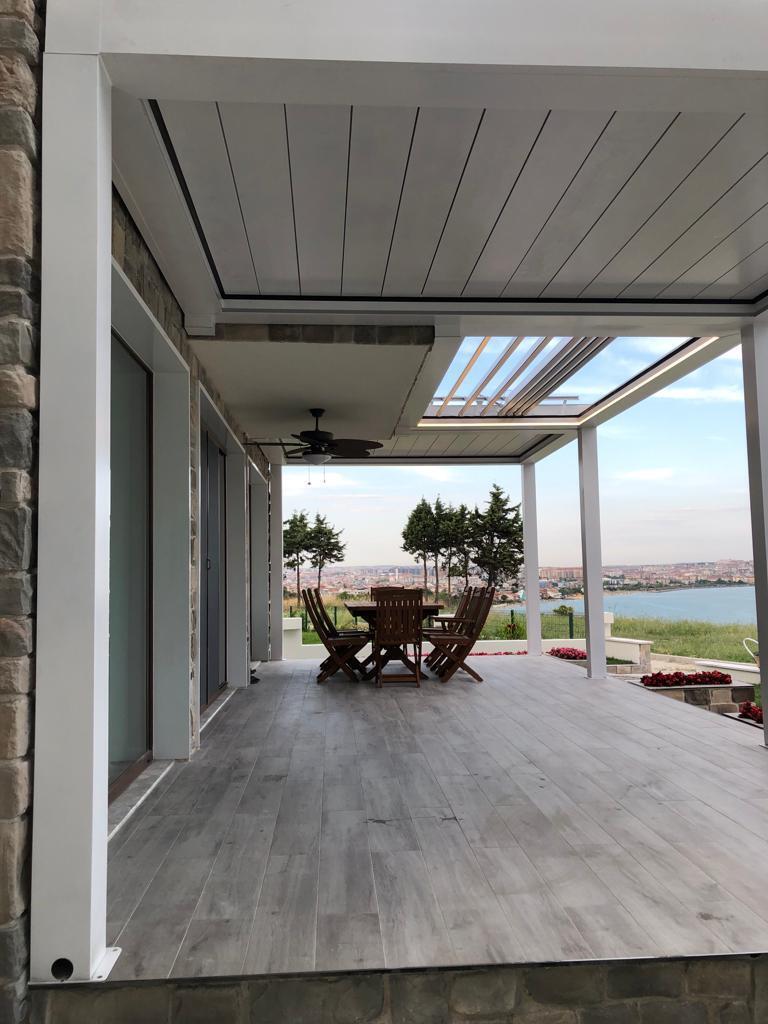 Dadurch, dass sich die Paneele in bestimmten Winkeln harmonisch zueinander drehen können, profitieren Sie vom Tageslicht. Die Paneele spielen auch eine aktive Rolle bei der Belüftung des Bereichs. Es hat ein Aluminiumdesign. Im Freien, sowohl für ein dekoratives Erscheinungsbild als auch um von den Wetterbedingungen profitieren zu können. bioklimatische Pergola du kannst wählen.